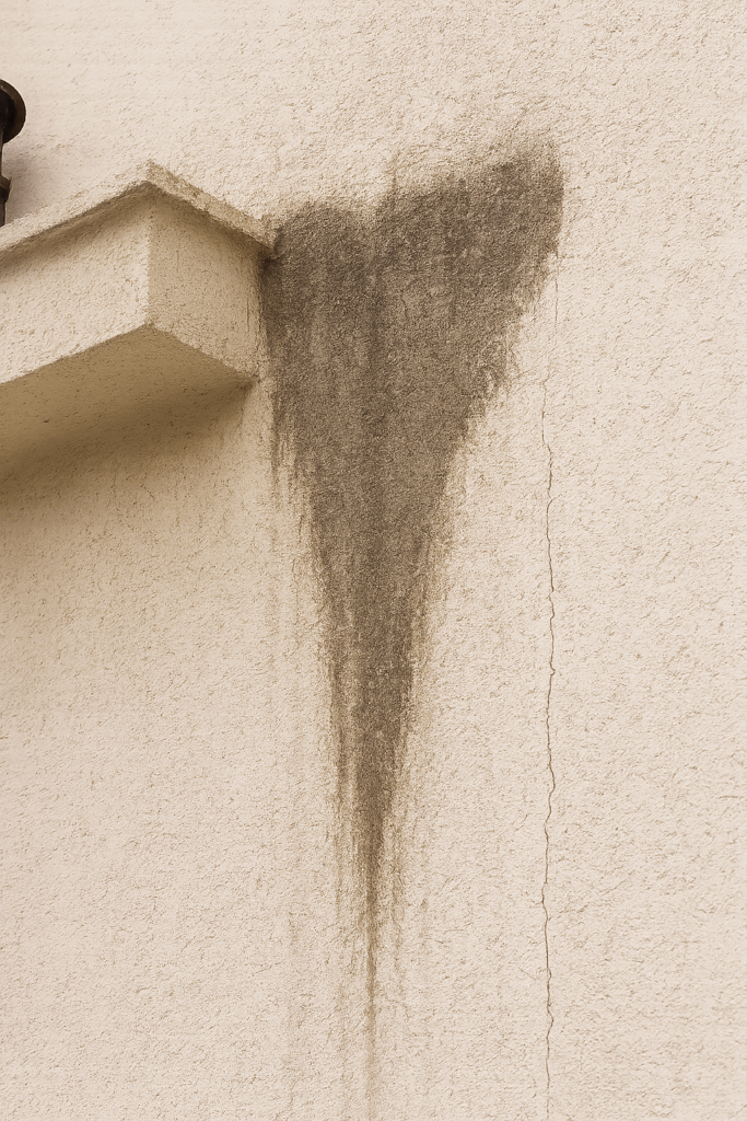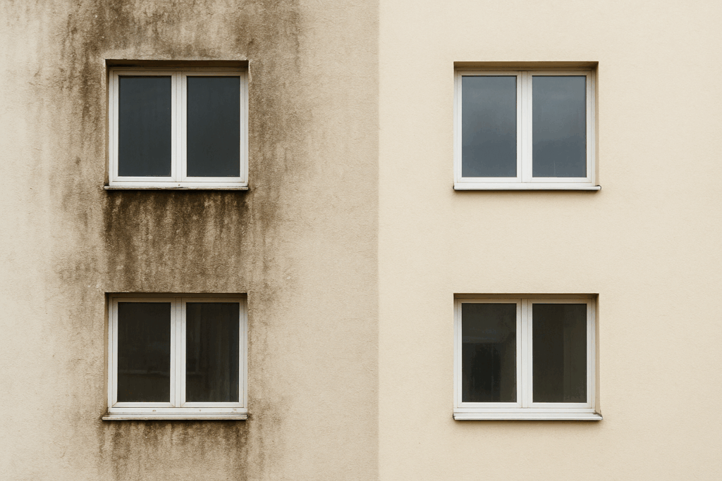 Seja em paredes de concreto, vidro ou ACM, manchas escuras ou esverdeadas indicam infiltração e acúmulo de umidade. Além de prejudicar a aparência, favorecem fungos e podem comprometer a estrutura.