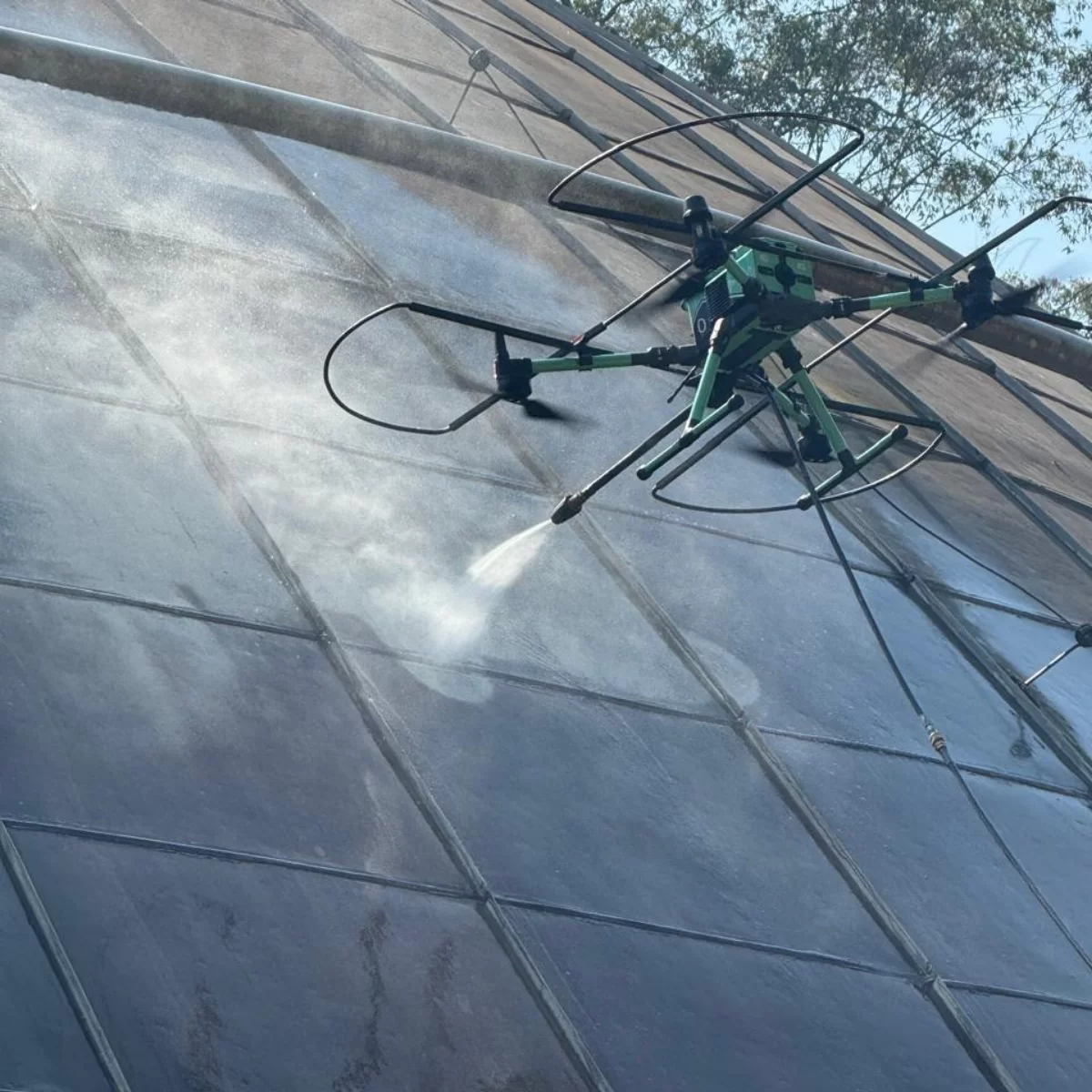 Os drones são equipados com sistemas de alta precisão que garantem aplicação uniforme de produtos de limpeza, economizando água e produtos químicos, além de aumentar a eficiência do processo. Cada operação é controlada remotamente, permitindo ajustes em tempo real e total monitoramento da execução.