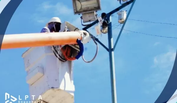 A troca de lâmpadas em altura exige planejamento detalhado e execução criteriosa. Na LPTA, todos os serviços seguem as normas NR-35 (trabalho em altura) e NR-10 (segurança em instalações elétricas).